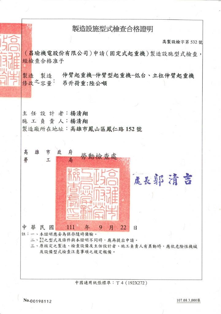 • 固定式6公噸製造設施型式檢查合格證書(伸臂式起重機)