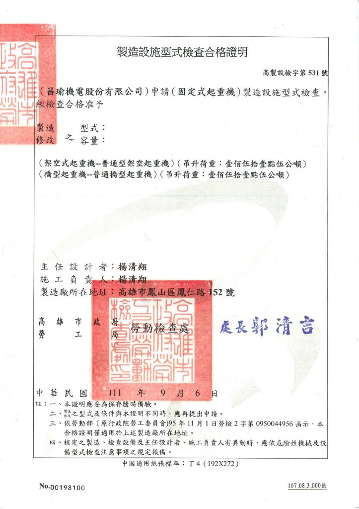 • 固定式150公噸製造設施型式檢查合格證書(普通型架空移動式起重機、普通橋型起重機)